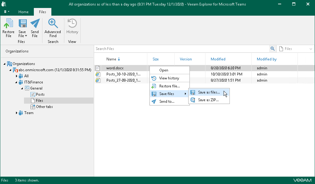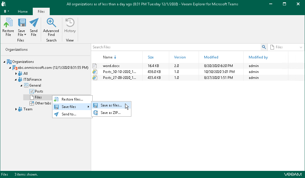 You can use Veeam Explorer for Microsoft Teams to save files published in a team channel to a specified location. You can save all files of a channel or specific posts.