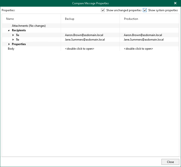To view the details on what exactly has changed since the last backup, right-click an item and select Compare item properties. The discrepancies will be shown in the Compare Message Properties window. If both objects are equal, nothing will be displayed.