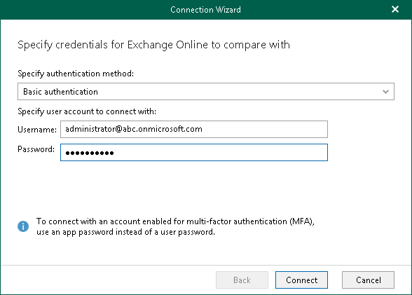 - Enter credentials to connect to the Exchange organization and click Connect.