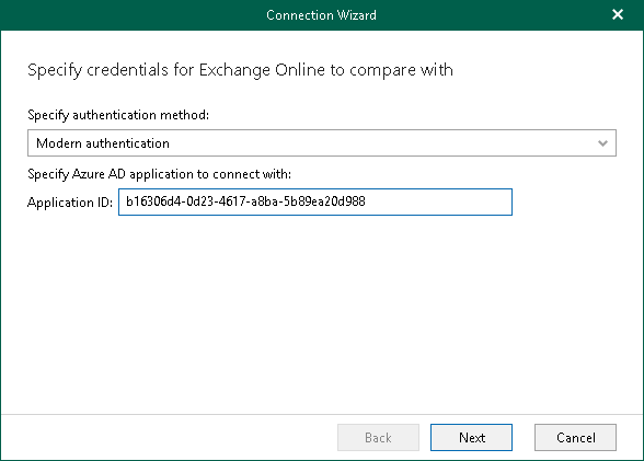 By default, Veeam Explorer for Microsoft Exchange populates this field with the identification number of the application that was used during a backup session. If you want to use another application, make sure to grant this application required permissions. For more information, see the Azure AD Application Permissions section of the Veeam Backup for Microsoft 365 User Guide.