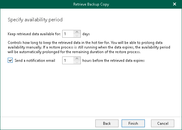 At this step of the wizard, specify the availability period that you want to apply for the retrieved backed-up data. During this period you will be able to explore and restore your data using Veeam Explorers. For more information, see Exploring Retrieved Data.