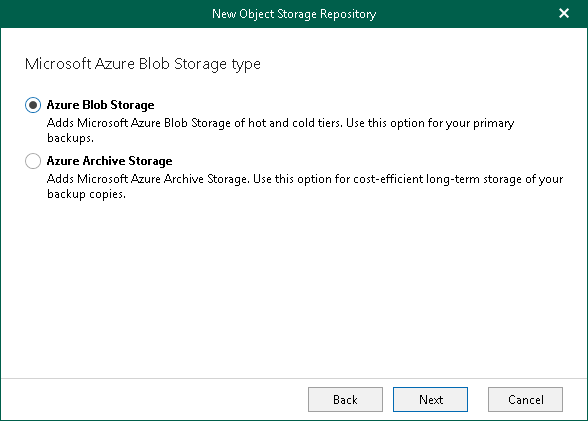 - Azure Archive Storage. Select this option if you want to use this object storage as a target for backup copy jobs.