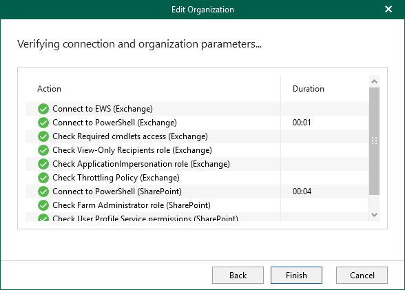 This is an archive version of the document. To get the most up-to-date information, see the current version. Step 5. Finish Working with Wizard At this step of the wizard, wait for a connection to be established and click Finish.An on-premises Microsoft organization appears under the Organizations node in the inventory pane.