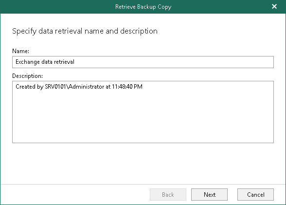 This is an archive version of the document. To get the most up-to-date information, see the current version. Step 2. Specify Retrieval Job Name At this step of the wizard, edit the suggested name for the retrieval job if needed and provide optional description:In the Name field, edit the retrieval job name that Veeam Backup for Microsoft 365 suggests.In the Description field, enter optional description.