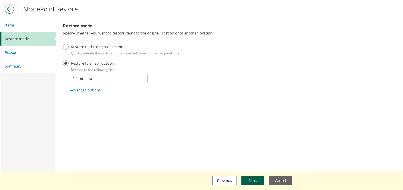 Mind that if you restore document libraries, lists or documents and the specified list does not exist, it will be created automatically. If you restore list items, make sure to specify a list that exists in the original SharePoint site.