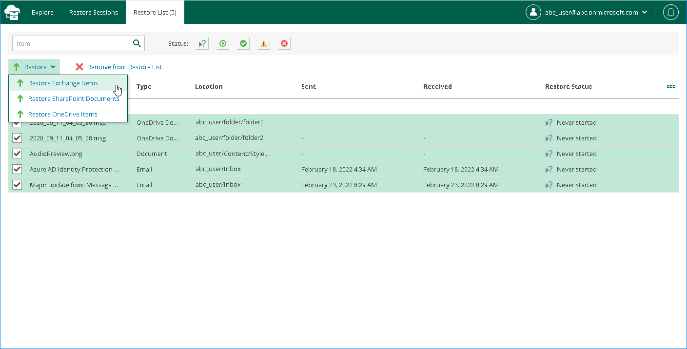 If you want to select items located in different folders in the hierarchy of folders with backed-up data displayed in the navigation pane, you can add them to the restore list. For example, you can add to the restore list one by one items of different types: mailbox items, OneDrive and SharePoint files, and proceed to their restore.