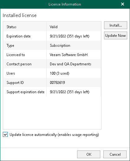 - If you install Rental or Subscription license, Veeam Backup for Microsoft 365 prompts you to allow the product to update your license automatically when you renew or expand your contract. If you agree, in the displayed window, click Yes.