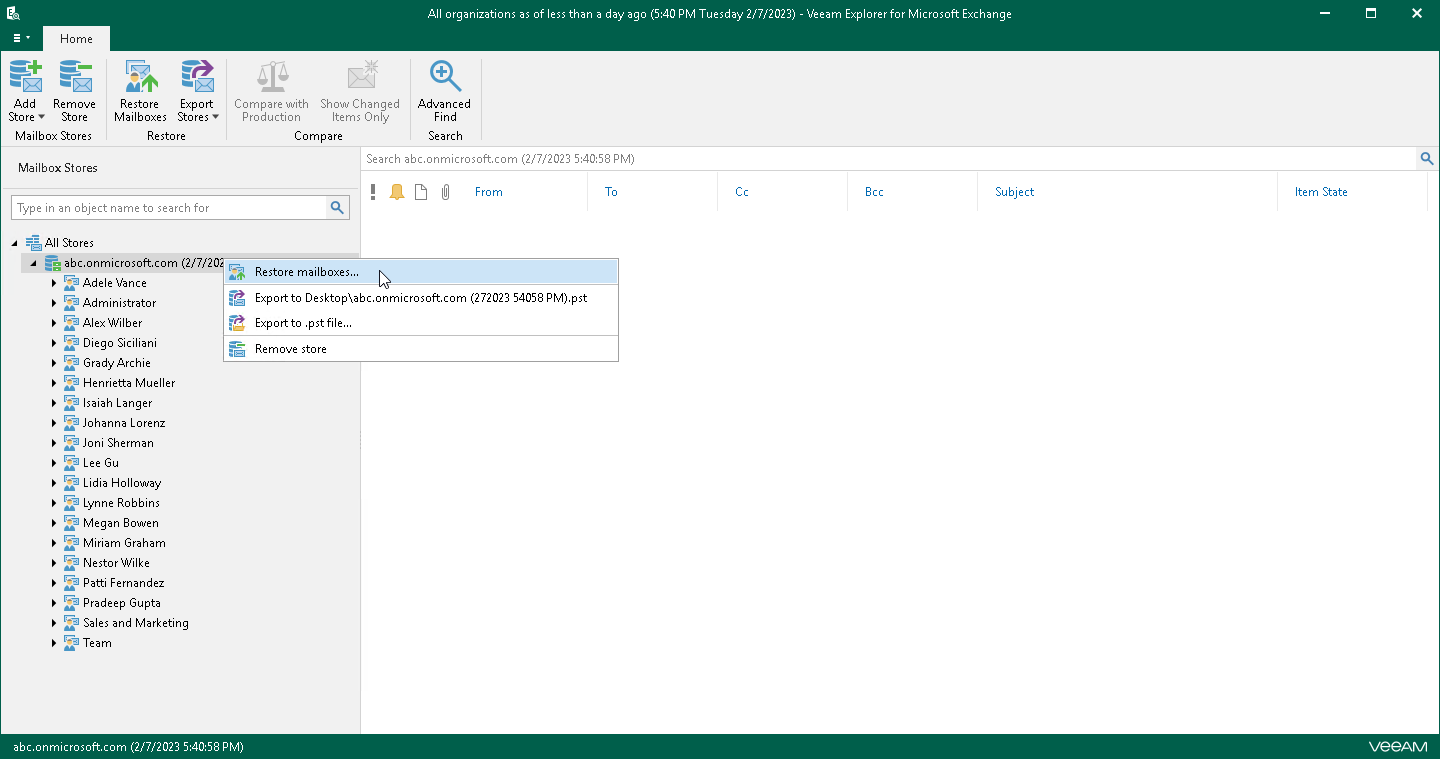 This is an archive version of the document. To get the most up-to-date information, see the current version. Step 1. Launch Restore Wizard To launch the Restore wizard, do one the following:In the navigation pane, select an organization whose mailboxes you want to restore, and on the Home tab, click Restore Mailboxes.In the navigation pane, right-click an organization and select Restore mailboxes.