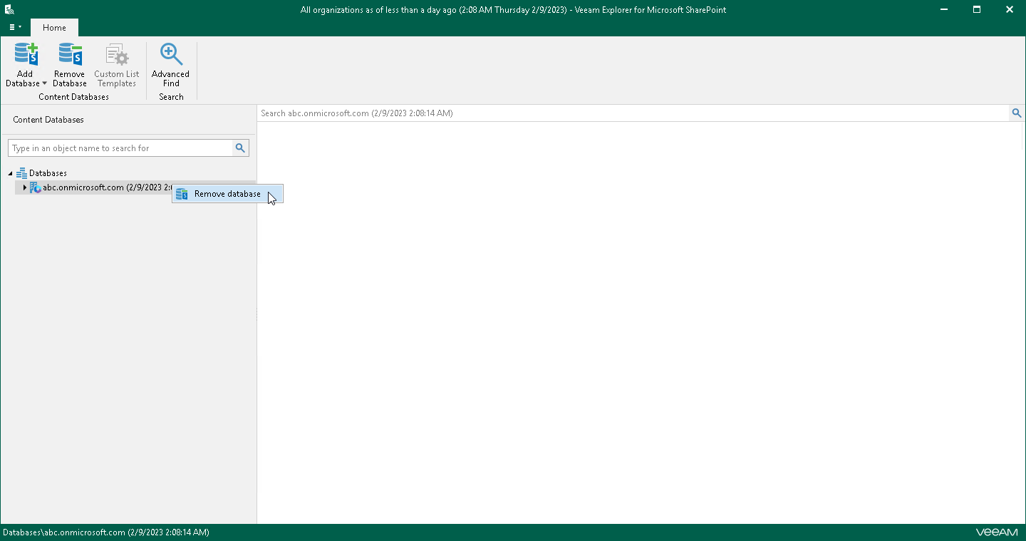 This is an archive version of the document. To get the most up-to-date information, see the current version. Removing Databases Veeam Explorer for Microsoft SharePoint allows you to remove Microsoft SharePoint databases from the application scope when you no longer need it.To remove a database from the application scope, right-click a database in the navigation pane and select Remove database.