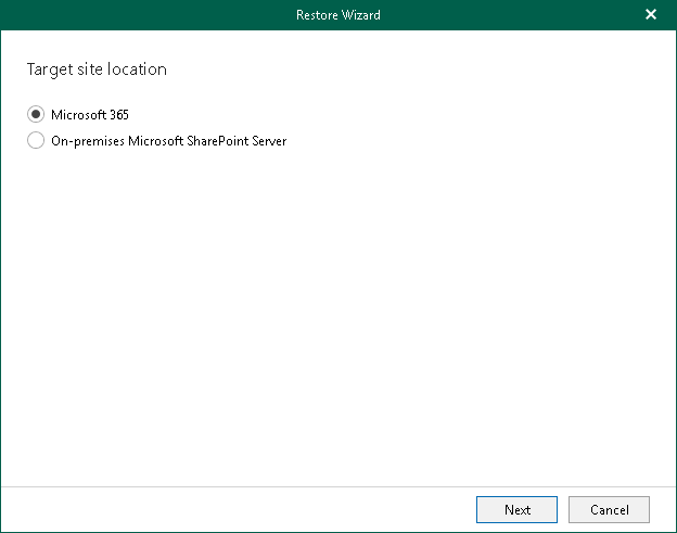 At this step of the wizard, select Microsoft 365 to restore the document library or list to a SharePoint Online organization with enabled multi-factor authentication (MFA). For more information, see the Adding Microsoft 365 Organizations section of the Veeam Backup for Microsoft 365 User Guide.