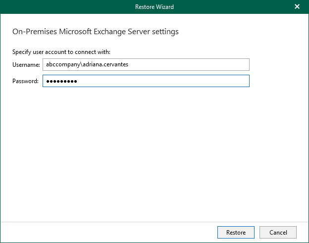 This is an archive version of the document. To get the most up-to-date information, see the current version. Step 2. Specify User Account At this step of the wizard, specify an account that you want to use to connect to the Exchange server and click Restore.NoteThis step of the wizard is only available in the following cases:When the machine where Veeam Explorer for Microsoft Exchange is opened and the Microsoft Exchange server belong to different domains.When the account used to run Veeam Explorer for Microsoft Exchange does not exist on the domain of the Microsoft Exchange server.