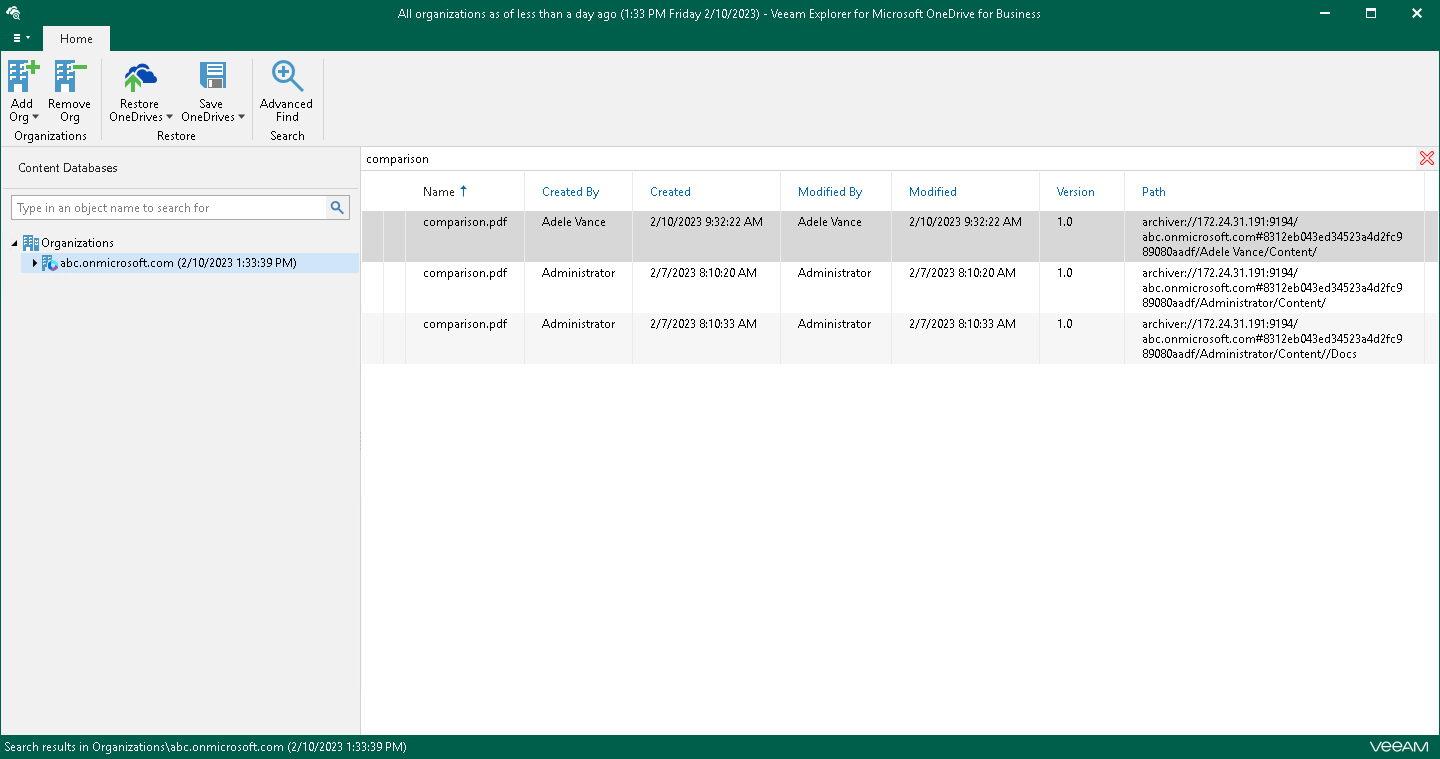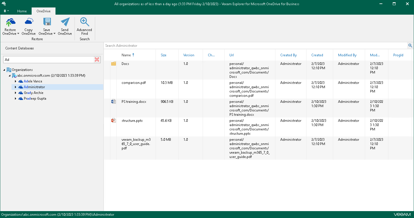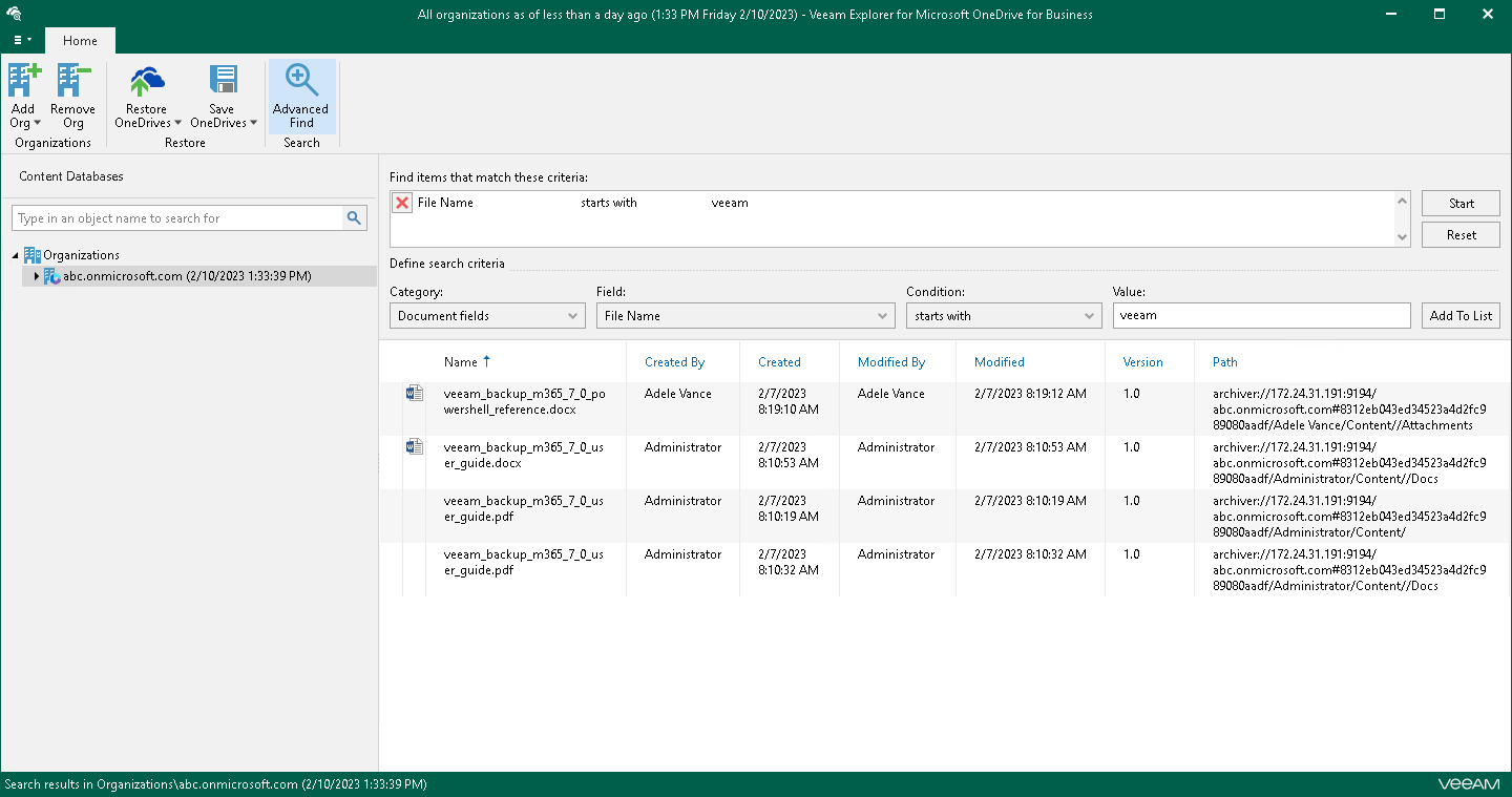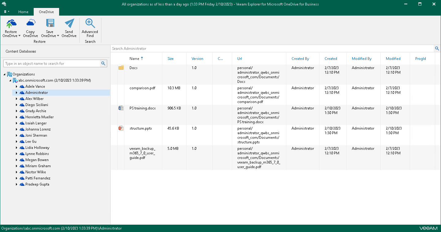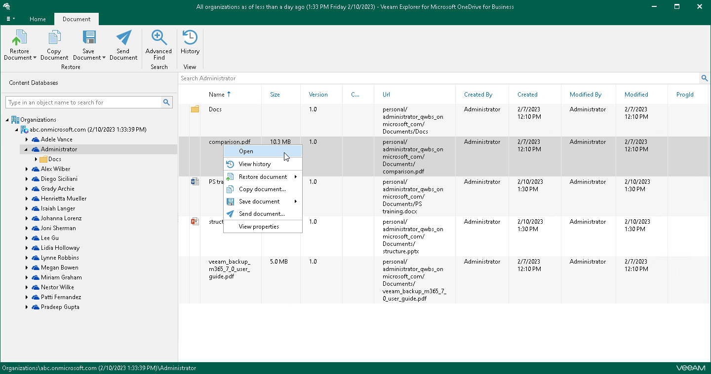 You can use Veeam Explorer for Microsoft OneDrive for Business to view the contents of a backup file, view object properties, open files, search for OneDrives and for items in a backup file as well as customize criteria of your search.