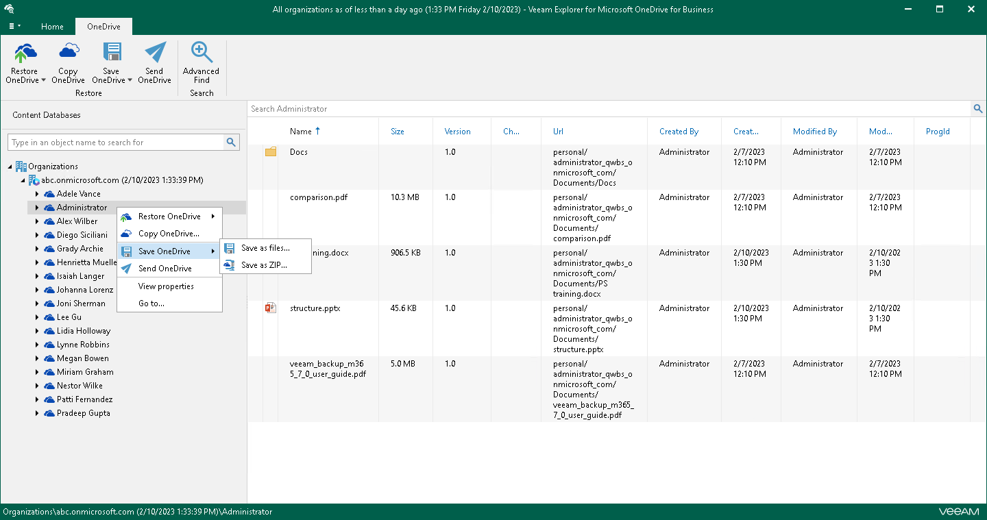 - Right-click an organization with OneDrives and select Save OneDrives > Save as files or Save OneDrives > Save as ZIP.