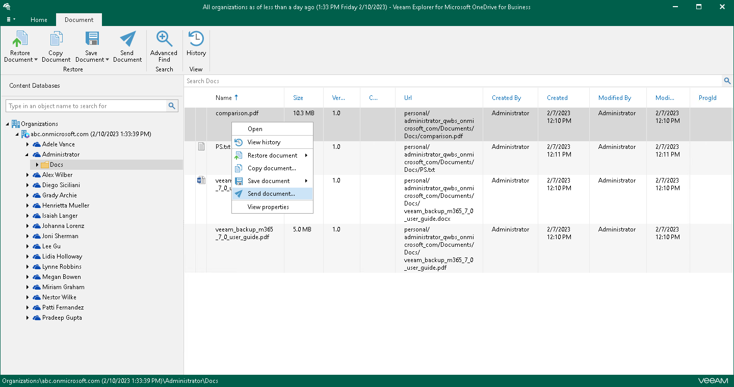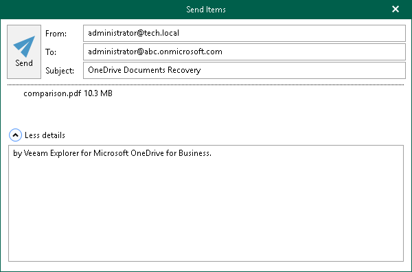 Veeam Explorer for Microsoft OneDrive for Business allows you to send OneDrive data to specified recipients by email.