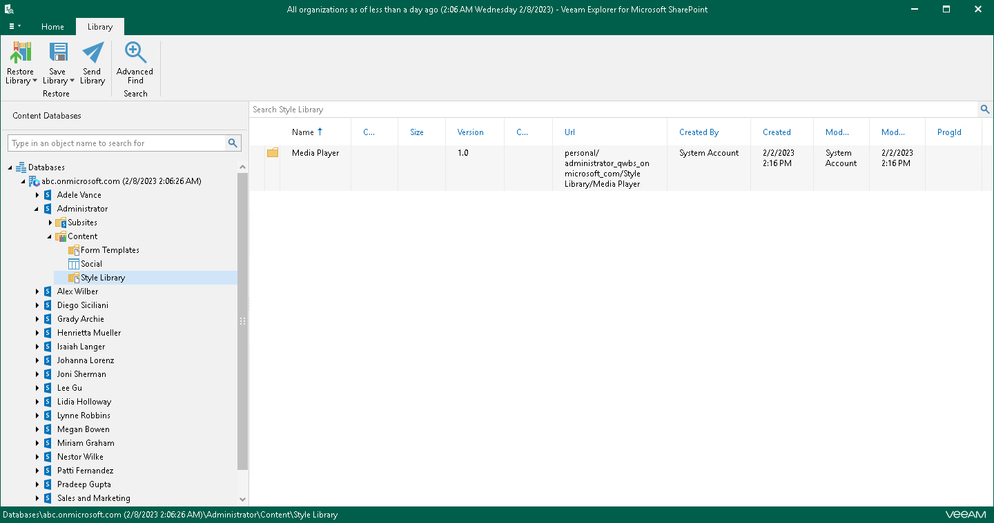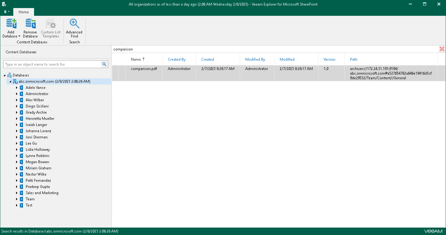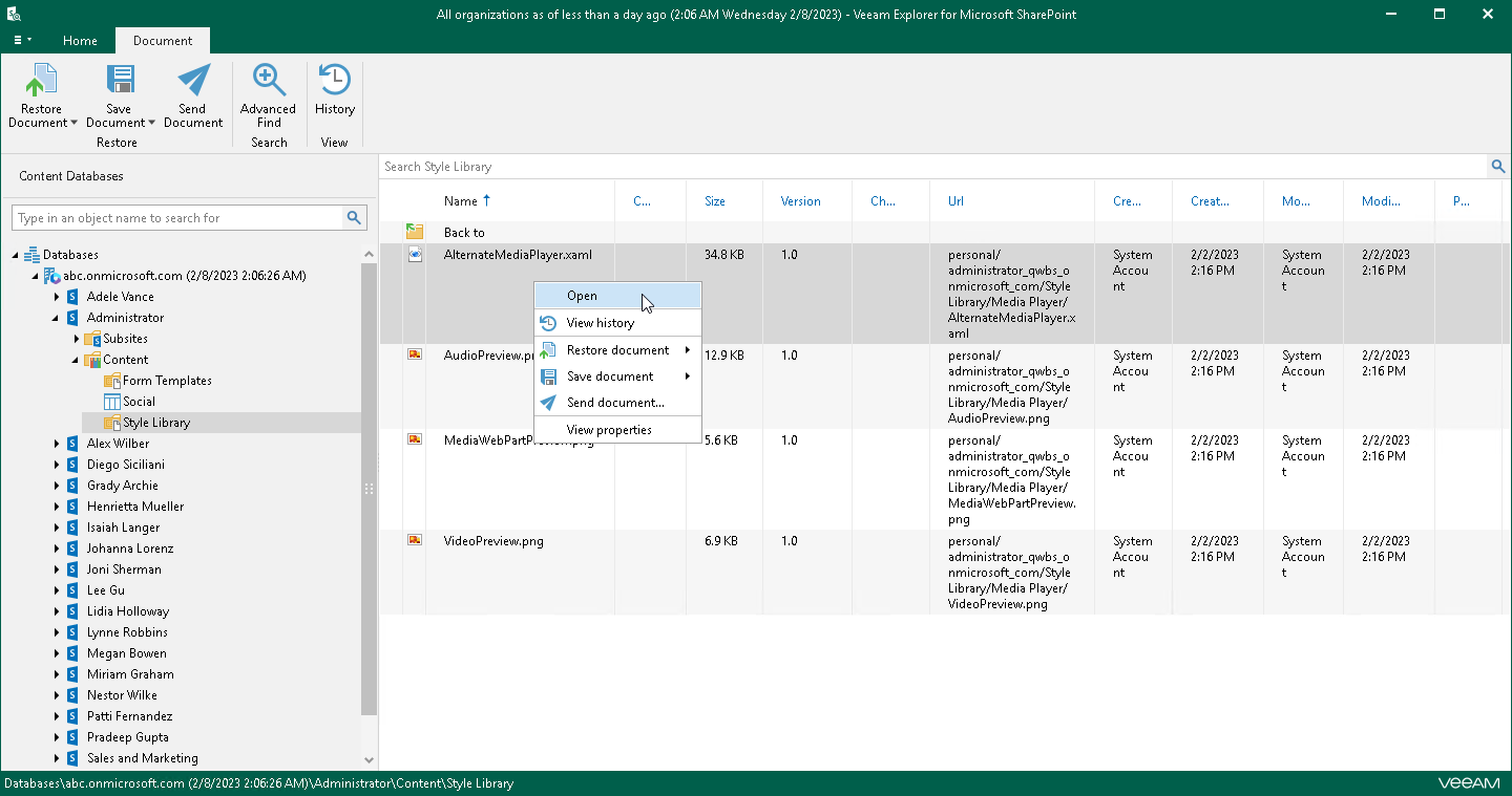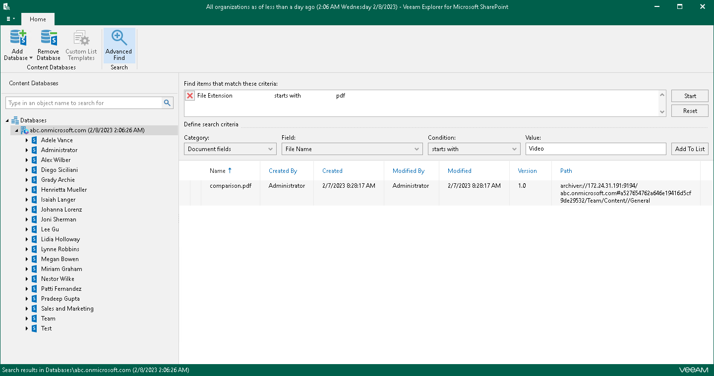 You can use Veeam Explorer for Microsoft SharePoint to view the contents of a backup file, view object properties, open files, search for sites and for items in a backup file as well as customize criteria of your search.