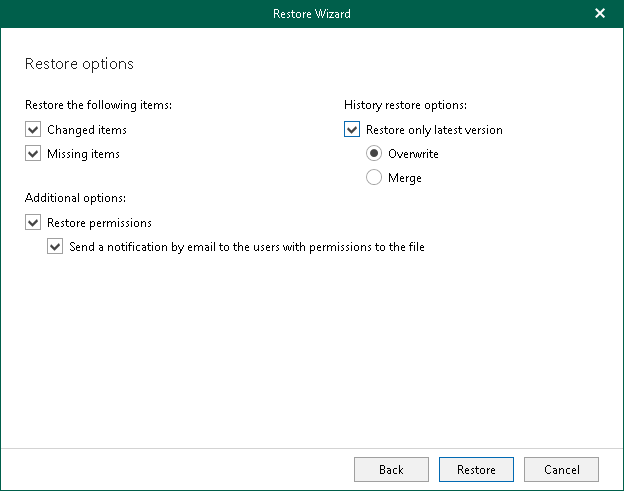 - Send a notification by email to the users with permissions to the file. Select this check box if you want to notify users about items restore. Veeam Explorer for Microsoft SharePoint will notify users with whom items have been shared. You can select this check box only if the Restore permissions check box is selected.