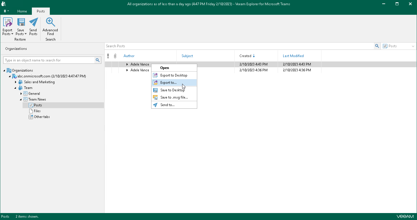 - Export to Desktop. Select this option if you want to perform the 1-Click Export operation. Veeam Explorer for Microsoft Teams will immediately export the post to the Desktop folder.