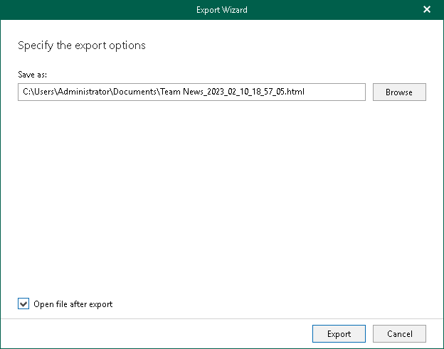 - In the Save as field, click Browse and browse to a folder where you want to save an HTML file with exported posts. By default, Veeam Explorer for Microsoft Teams exports posts to a file with the following name: <Channel_name>_<date_and_time>.html. For example: Team News_2023_02_10_18_57_05.html.