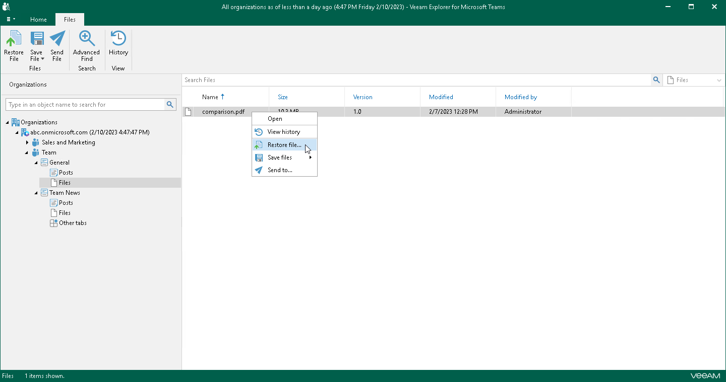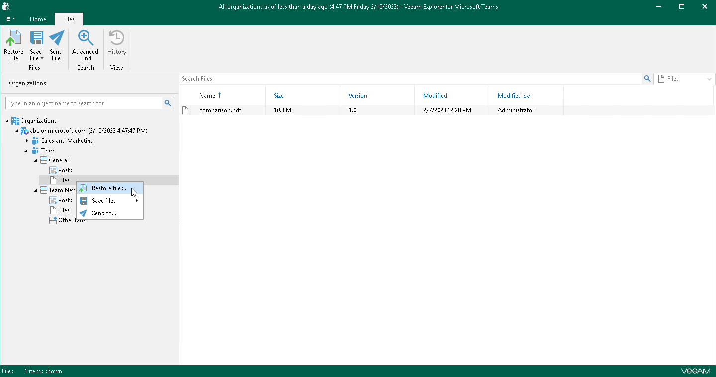 - In the navigation pane, expand a channel whose files you want to restore, right-click Files and select Restore files.