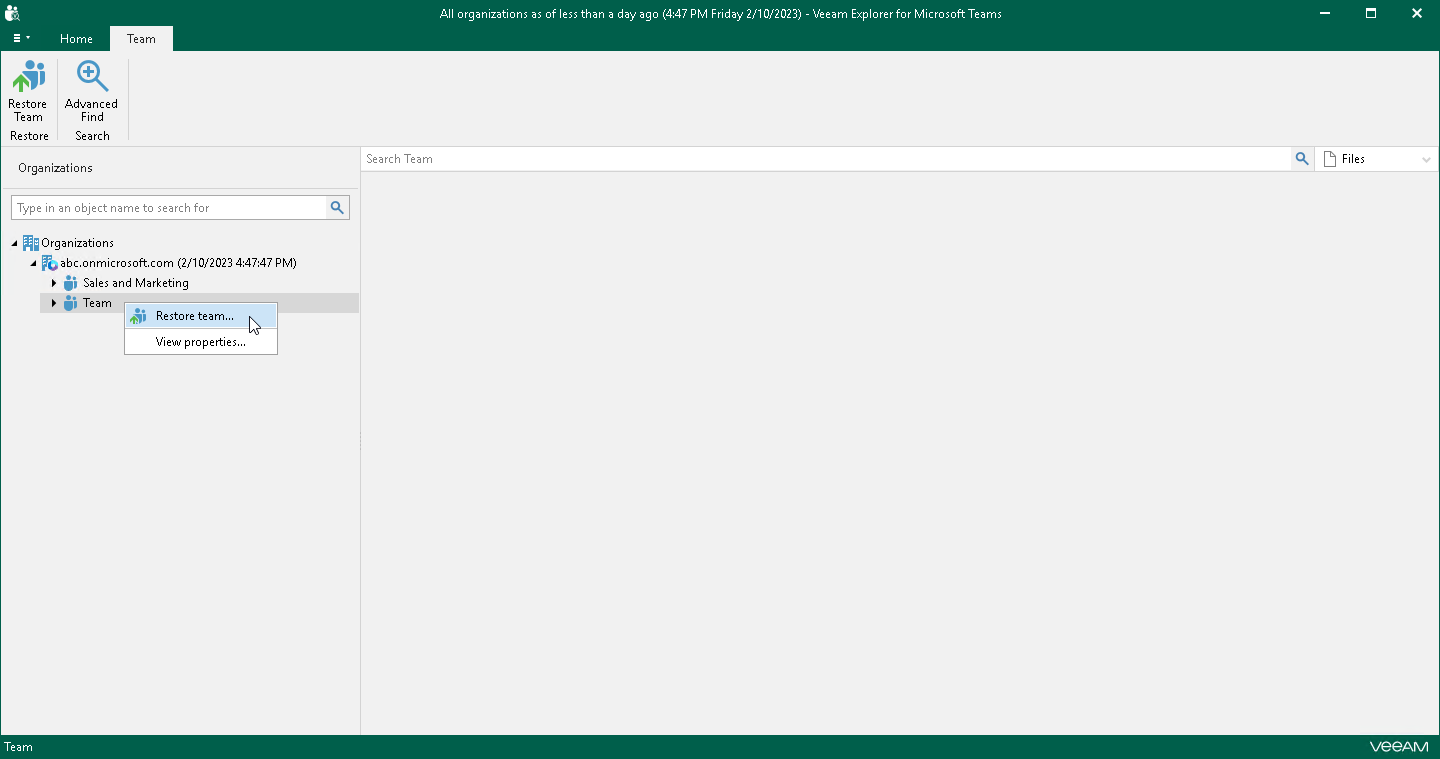 - In the navigation pane, right-click an organization whose teams you want to restore and select Restore teams.
