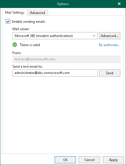 You can change the sender email address. To send email notifications on behalf of another Microsoft 365 account, specify a new email address in the From field and click Re-authorize. |