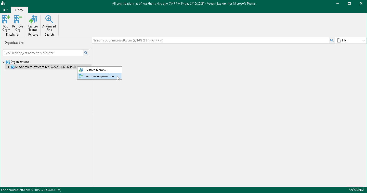 This is an archive version of the document. To get the most up-to-date information, see the current version. Removing Organizations Veeam Explorer for Microsoft Teams allows you to remove an organization from the application scope when you no longer need it.To remove an organization from the application scope, right-click an organization in the navigation pane and select Remove organization.