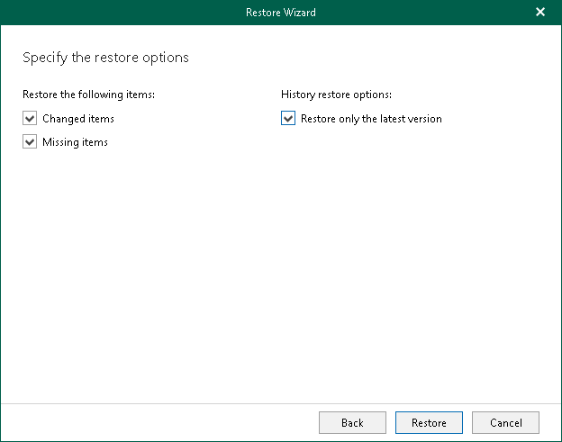 - Select the Missing items check box if you want to restore items that are missing in the target location. For example, some of the items were removed and you want to restore them from the backup.