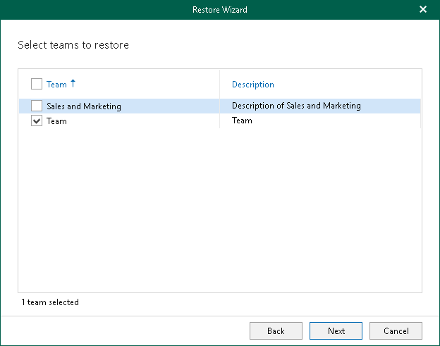This is an archive version of the document. To get the most up-to-date information, see the current version. Step 4. Select Teams This step is only available if you launched the Restore wizard to restore multiple teams.At this step of the wizard, select check boxes next to the teams that you want to restore.