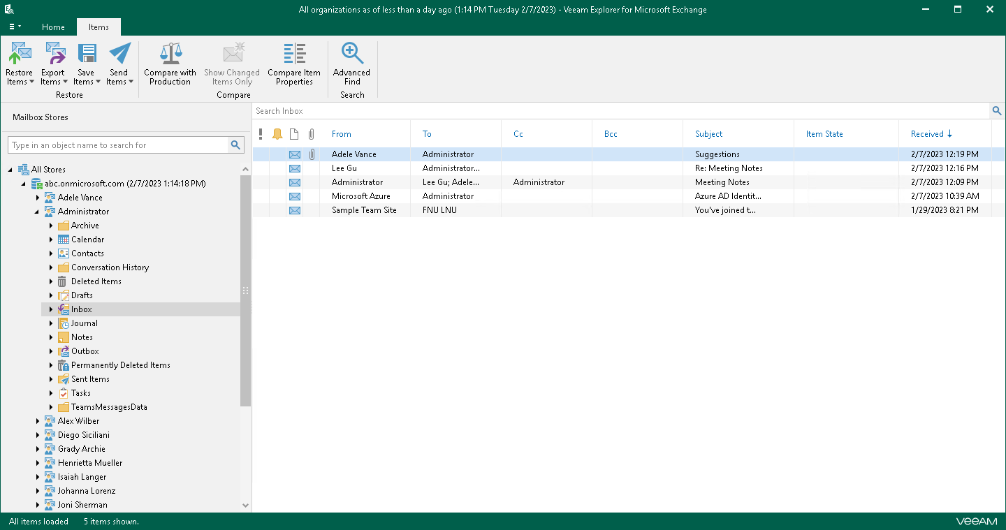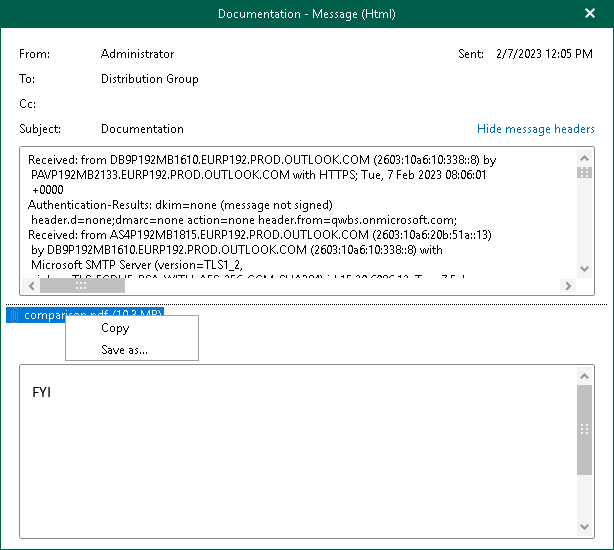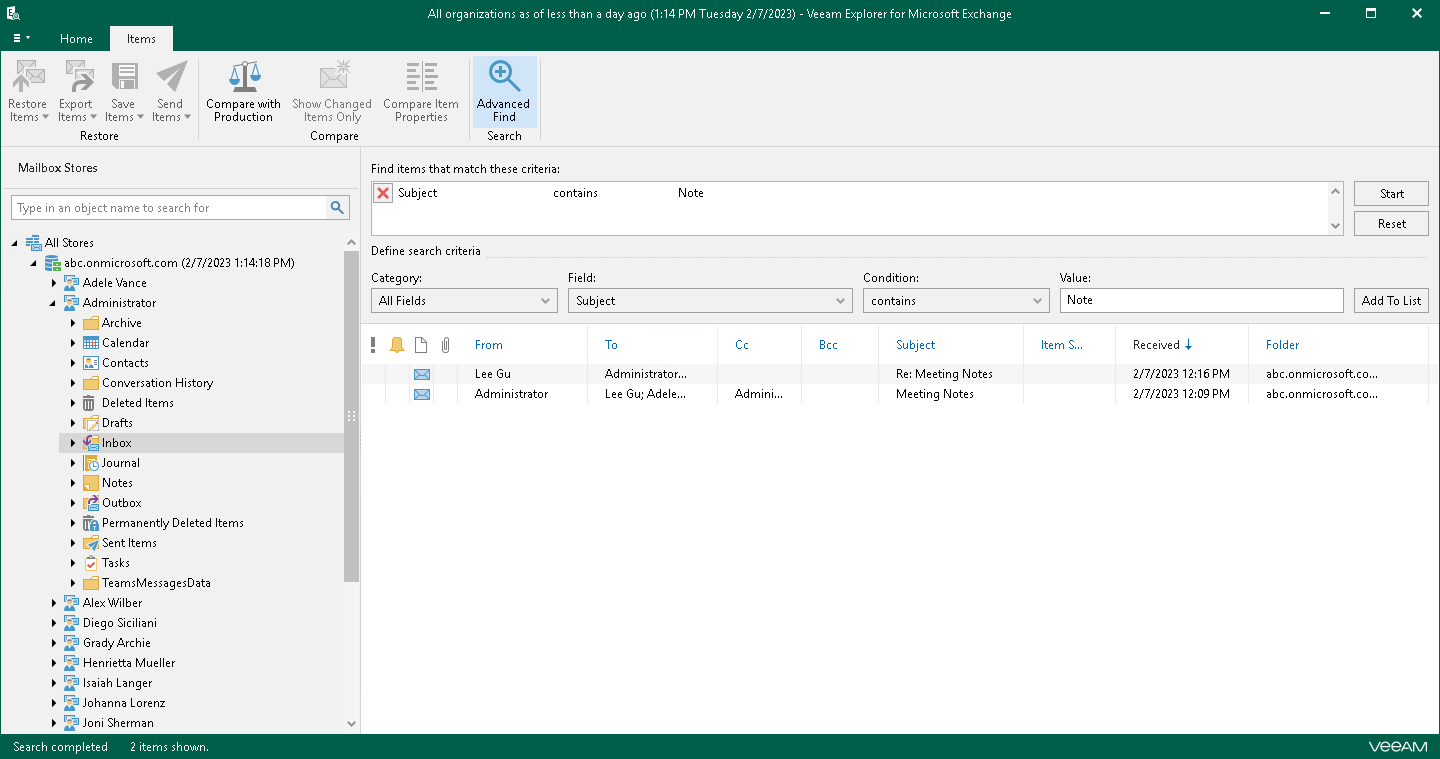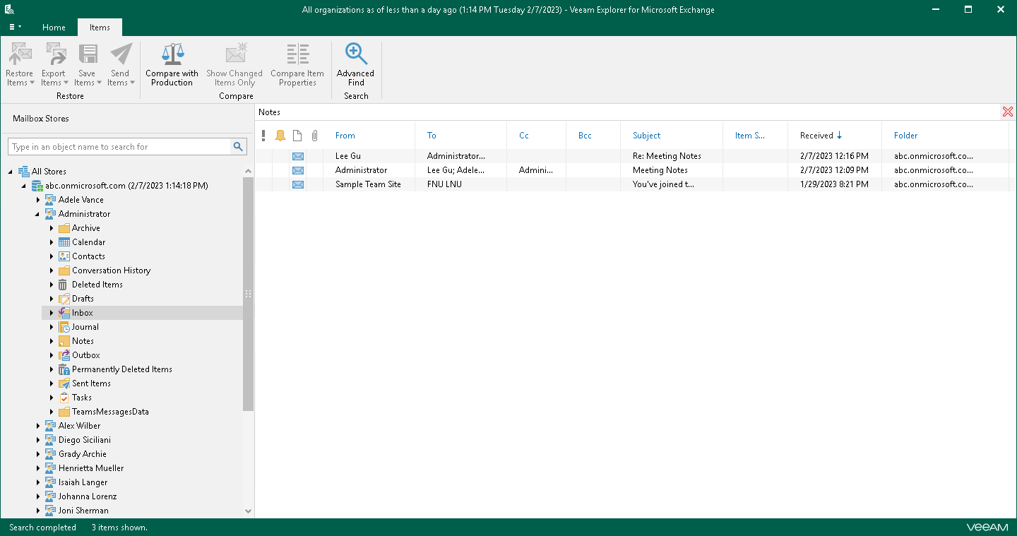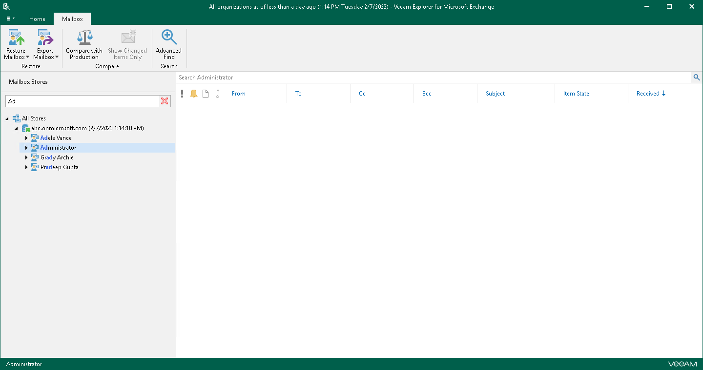 You can use Veeam Explorer for Microsoft Exchange to view the contents of a backup file, open messages, search for mailboxes and for items in a backup file as well as customize criteria of your search.