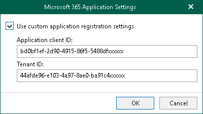 In the Microsoft 365 Application Settings window, select the Use custom application registration settings check box and specify:
