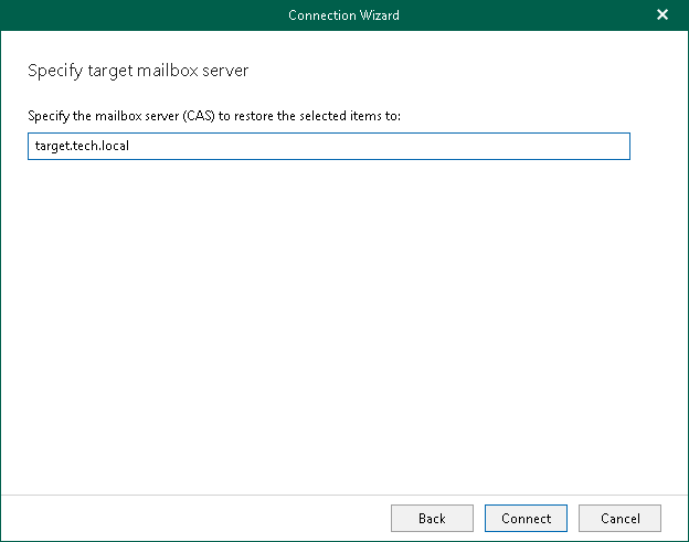 This is an archive version of the document. To get the most up-to-date information, see the current version. Step 2. Specify Target Mailbox Server At this step of the wizard, specify a target server to which you want to restore mailboxes and click Connect.