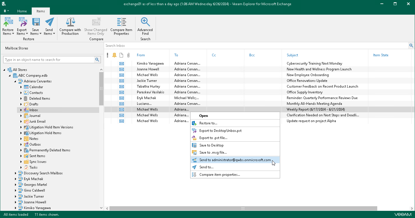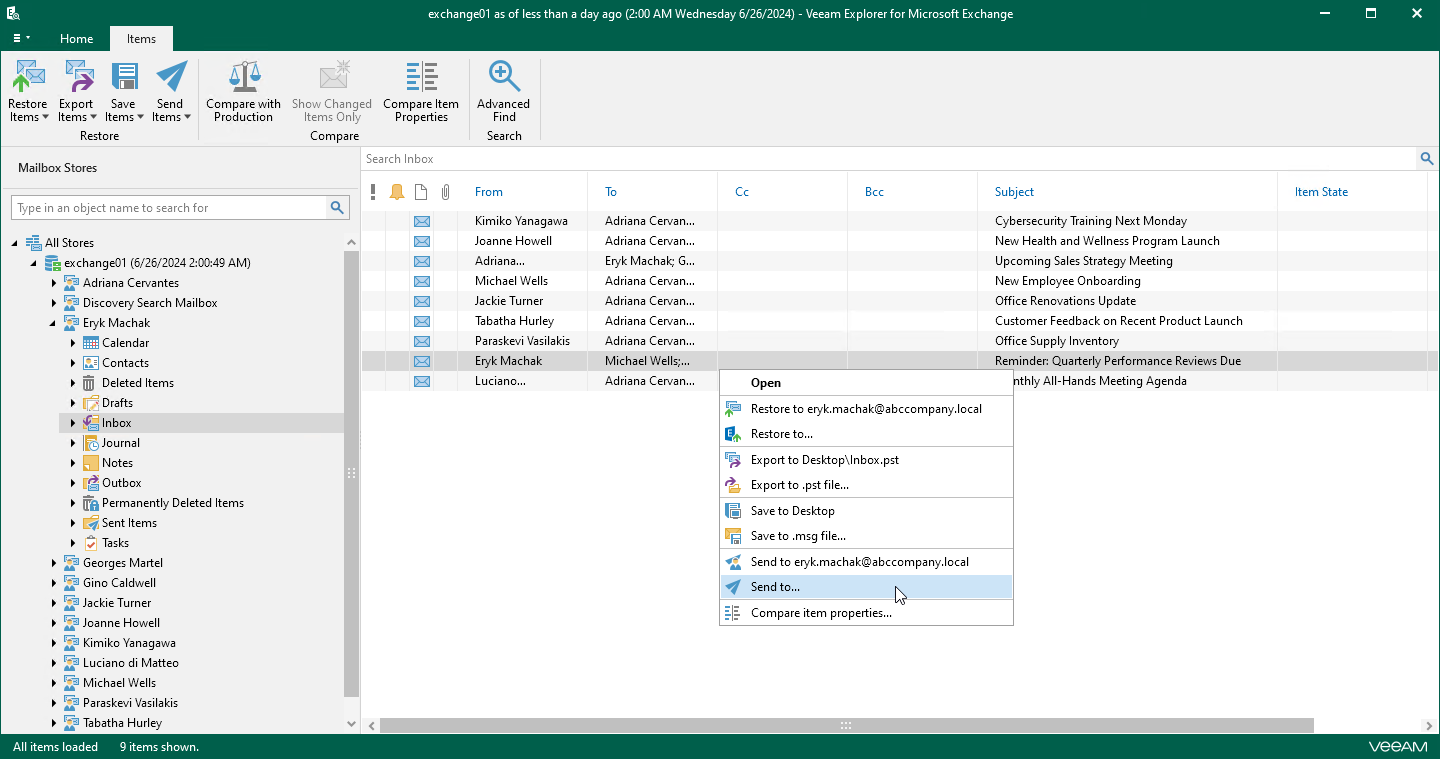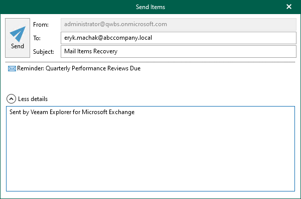 Veeam Explorer for Microsoft Exchange allows you to send Exchange items by email.