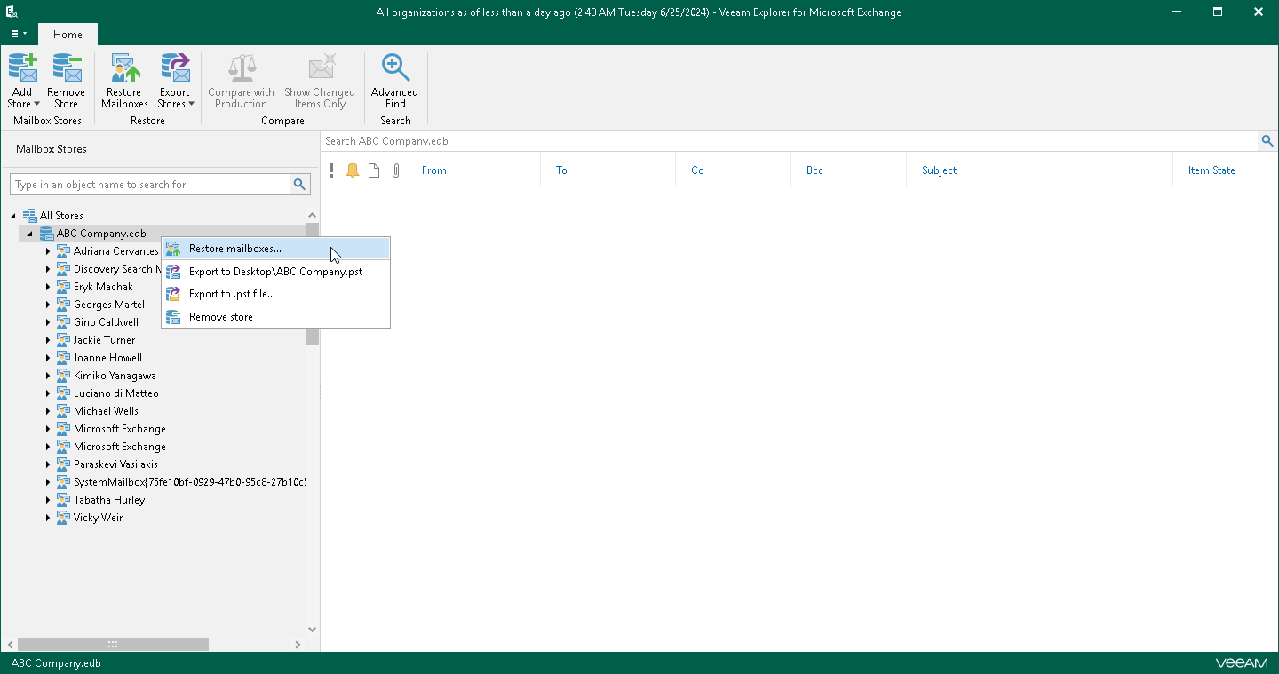 • In the navigation pane, right-click an organization and select Restore mailboxes.