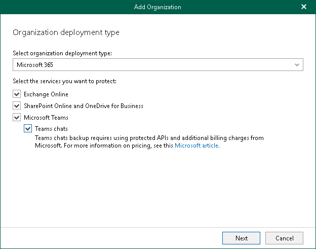 This check box is available only if the Microsoft Teams check box is selected. For more information on how to back up team chats, see Organization Object Types.