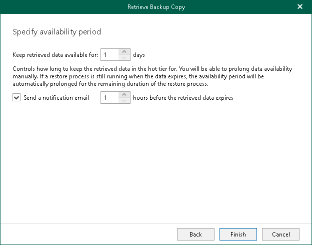 At this step of the wizard, specify the availability period that you want to apply for the retrieved backed-up data. During this period you will be able to explore and restore your data using Veeam Explorers. For more information, see Exploring Retrieved Data.