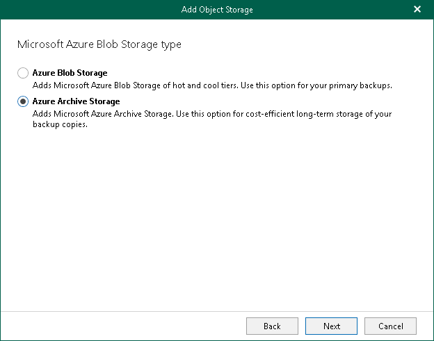 - Azure Archive Storage. Select this option if you want to use this object storage only to store backup copies and select it as a target for backup copy jobs. Veeam Backup for Microsoft 365 supports Azure Blob Storage Archive access tier for this purpose.