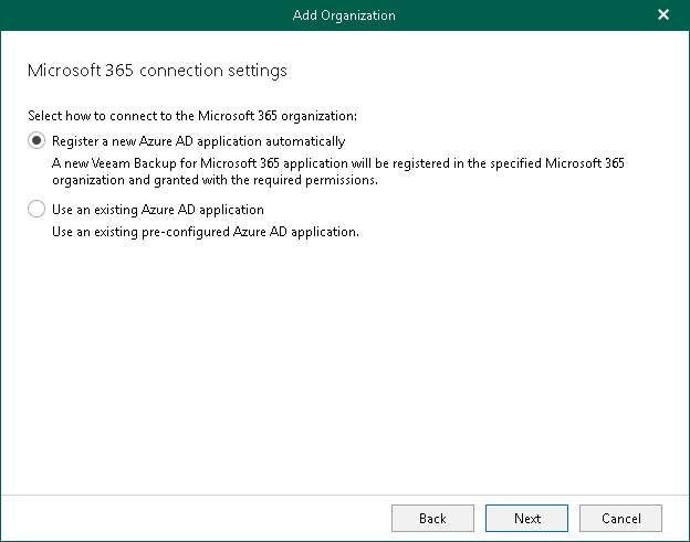At this step of the wizard, choose whether you want to register a new Azure AD application to connect to your Microsoft 365 organization or use an existing Azure AD application.