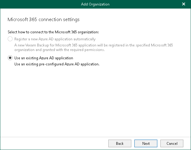 You can only select the Use an existing Azure AD application option. Veeam Backup for Microsoft 365 requires to provide connection parameters to the existing Azure AD application. For more information, see Using Existing Azure AD Application.