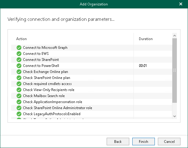 This is an archive version of the document. To get the most up-to-date information, see the current version. Step 6. Finish Working with Wizard At this step of the wizard, wait for a connection to be established and click Finish.The Microsoft 365 organization appears under the Organizations node in the inventory pane.