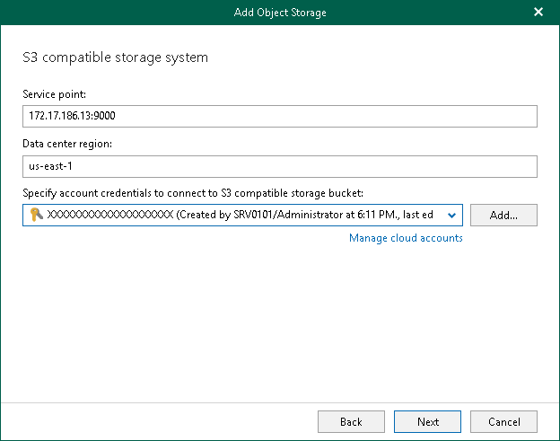 At this step of the wizard, specify a service point of your S3 Compatible device, select a datacenter region and specify account credentials.