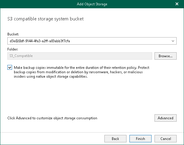 - Select the Make backup copies immutable for the entire duration of their retention policy check box to enable protection of backup copies against accidental data deletions, malware activity and modifications that may be performed by 3rd party applications. For more information about immutability, see Immutability.