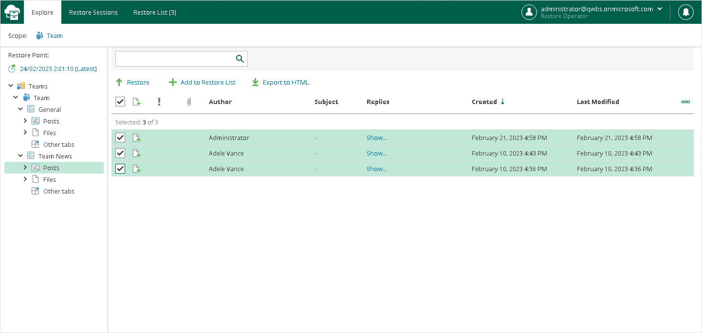 For Microsoft Teams posts, you can select which replies to the selected post you want to restore. To do this, in the Replies column, click Show, and in the displayed window, select check boxes next to replies that you want to restore.