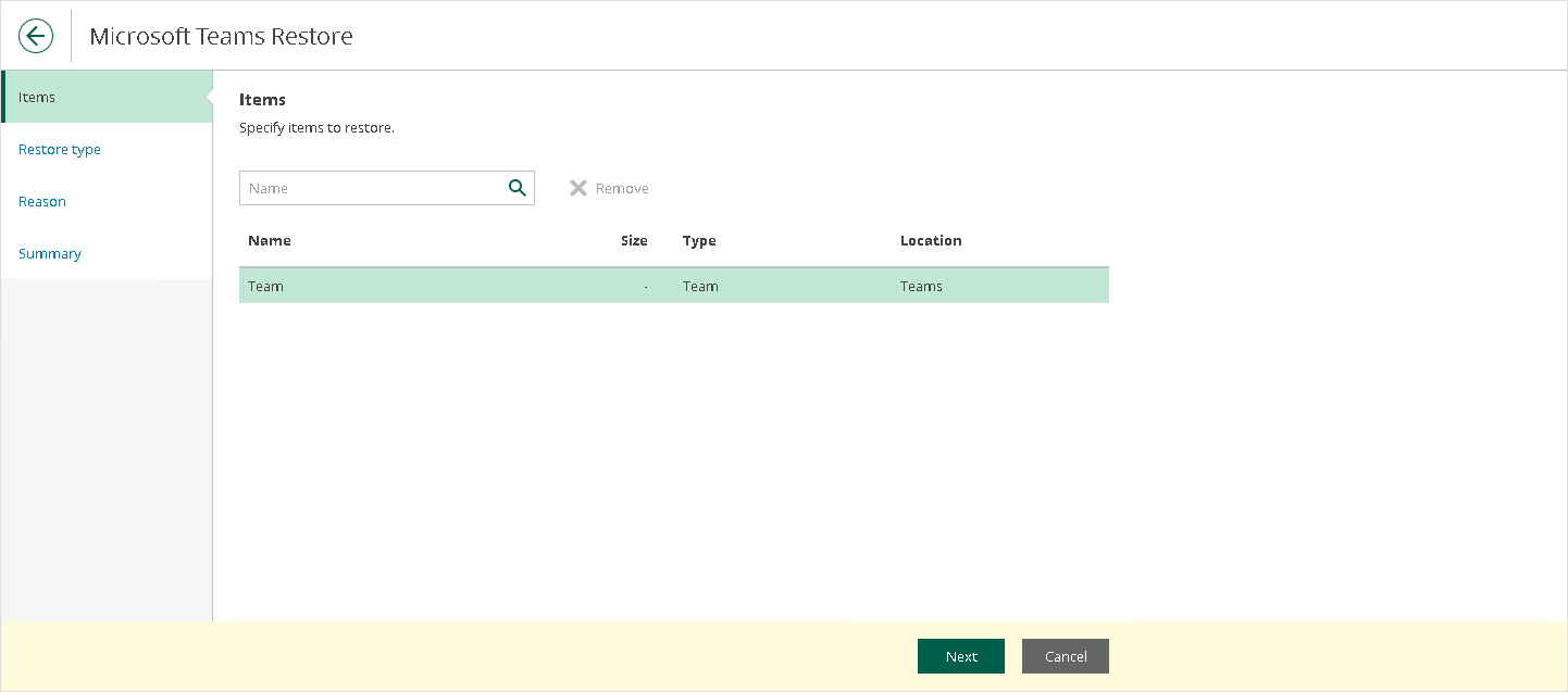 - At the Items step, specify items that you want to restore. If you no longer want to restore an item, select it and click Remove.