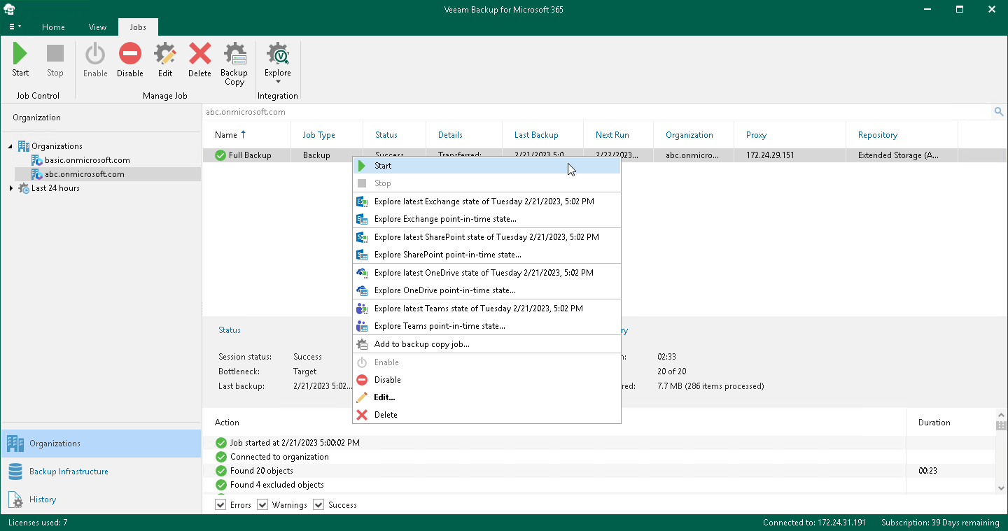 You can also select the root Organizations node to see all backup and backup copy jobs that were created for all organizations added to the scope. |