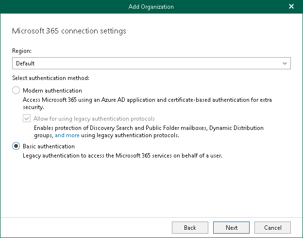 - Select the Basic authentication option to connect to your Microsoft 365 organization using the basic authentication method.