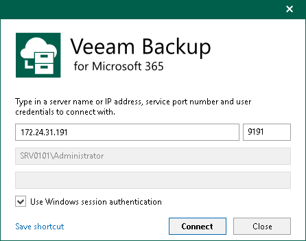 C:\Program Files\Veeam\Backup365\Veeam.Archiver.Shell.exe /host=192.168.0.12 /port=9895 /usewincredentials=true |
