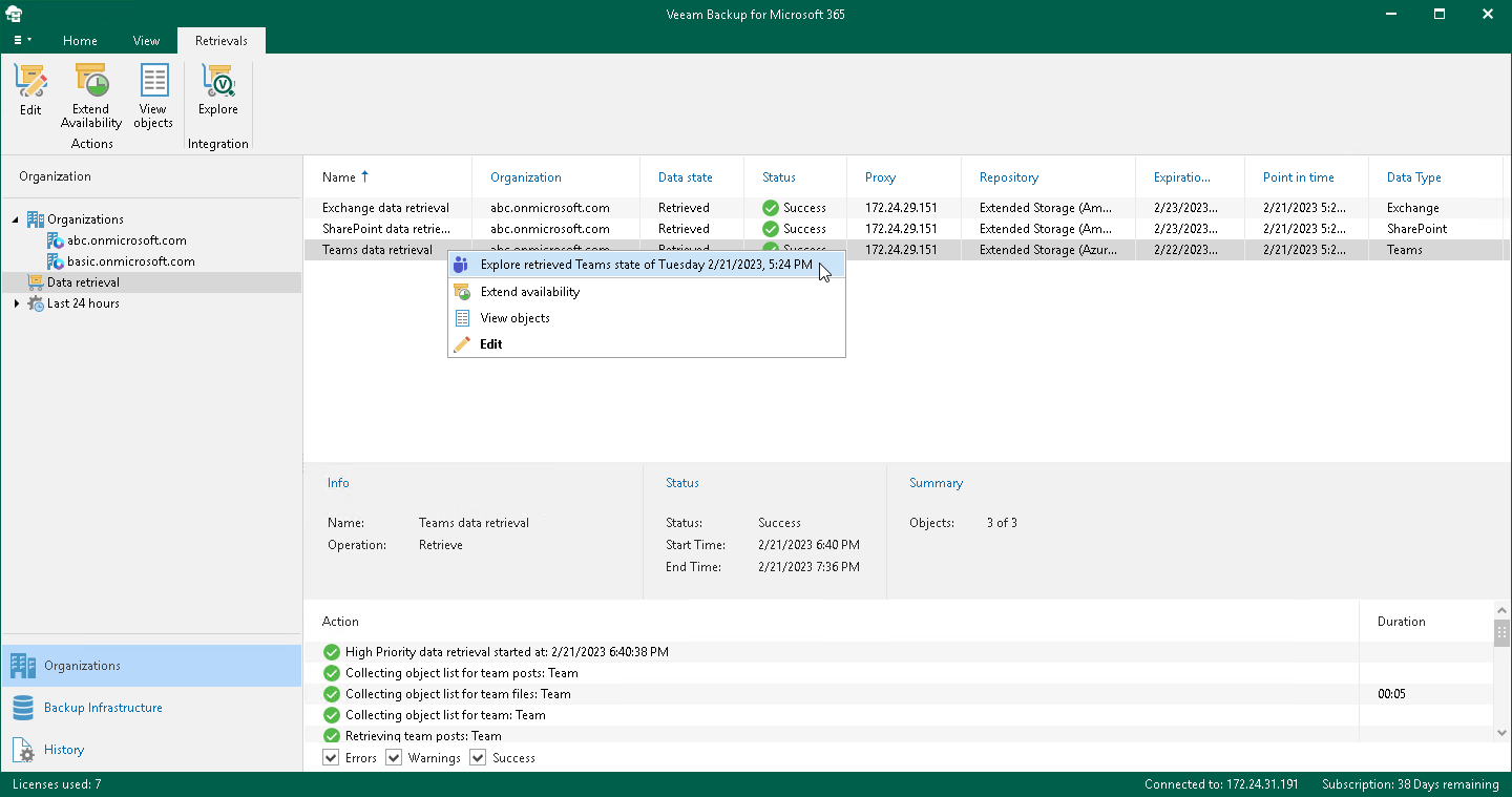 By default, the retrieved data is available for explore during 1 day. You can specify the availability period at the Specify Availability Period step of the Retrieve Backup Copy wizard. If the retrieved data is restored by Veeam Explorers, the availability period is prolonged automatically for the remaining duration of the restore process. You can extend the availability period. For more information, see Editing Retrieval Job Settings and Extending Availability of Retrieved Data. |