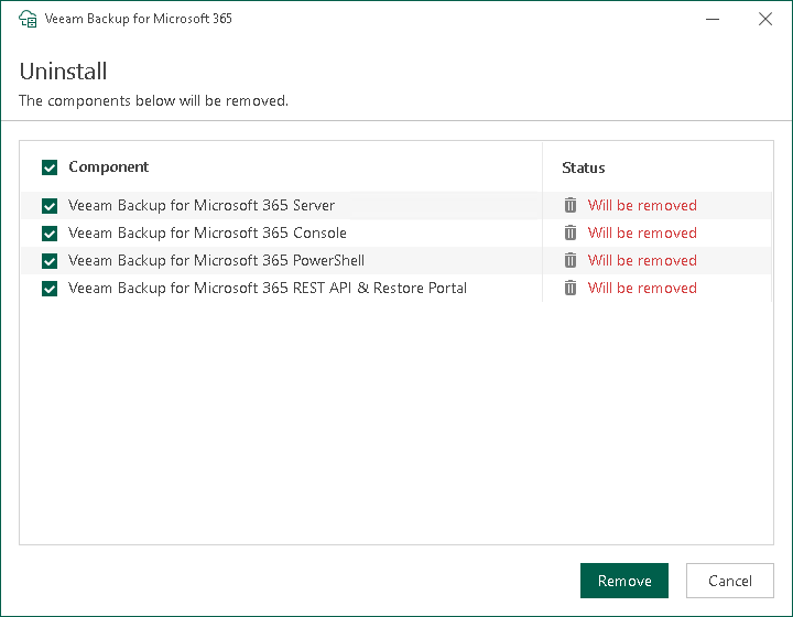 - At the Uninstall step, select check boxes next to the items that you want to uninstall and click Remove. Keep in mind that the Veeam Backup for Microsoft 365 uninstallation wizard uninstalls Veeam Explorers that are included in the Veeam Backup for Microsoft 365 installation package if you have only Veeam Backup for Microsoft 365 on your machine.