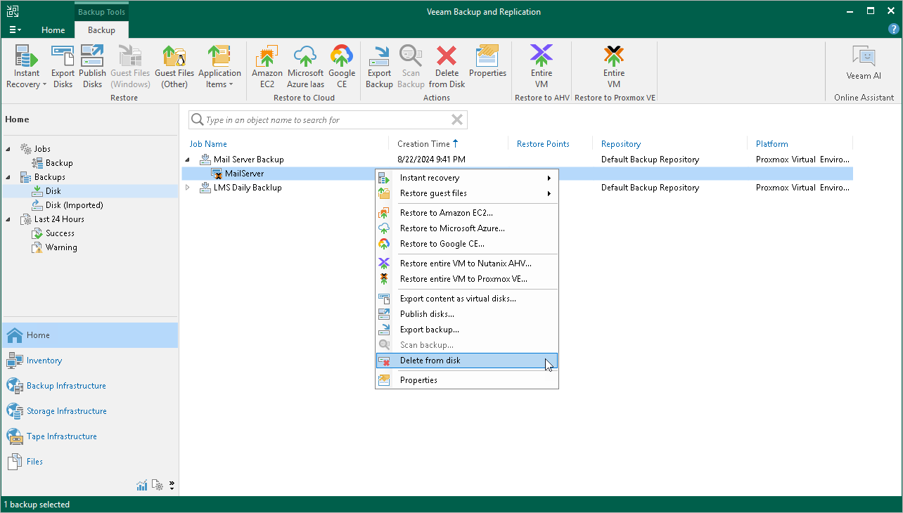 - In the working area, expand the job that created the backup, right-click the VM name and select Delete from disk.