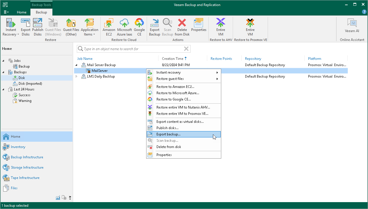 Once the export operation completes, the exported backup will be displayed under the Backups > Disk (Exported) node in the Home view of the Veeam Backup & Replication console.